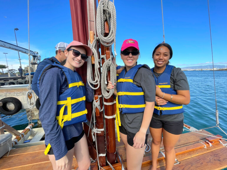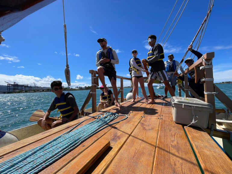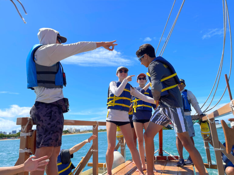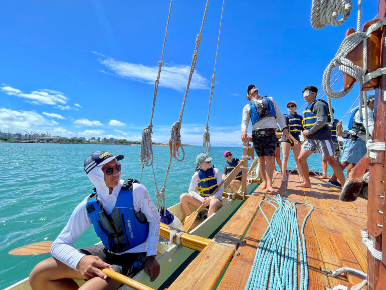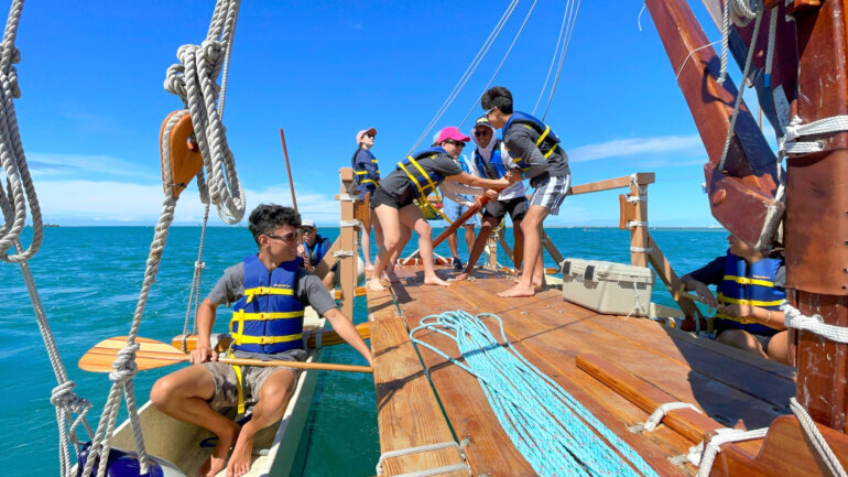 Students dove into oceanic wayfinding this summer in the social studies Senior Capstone course, Ke Kilohana: Voyaging. On campus and aboard Punahou’s sailing canoe, Kamaola, students learned the voyaging mindset, which encompasses oceanic navigation as well as environmental stewardship. In addition to multiple sails on Kamaola, students learned from local voyaging experts.