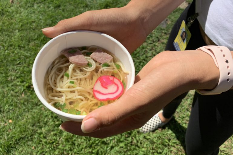 To raise money for AUW, members of the freshman class are selling saimin, while testing out a new biodegradable bowl