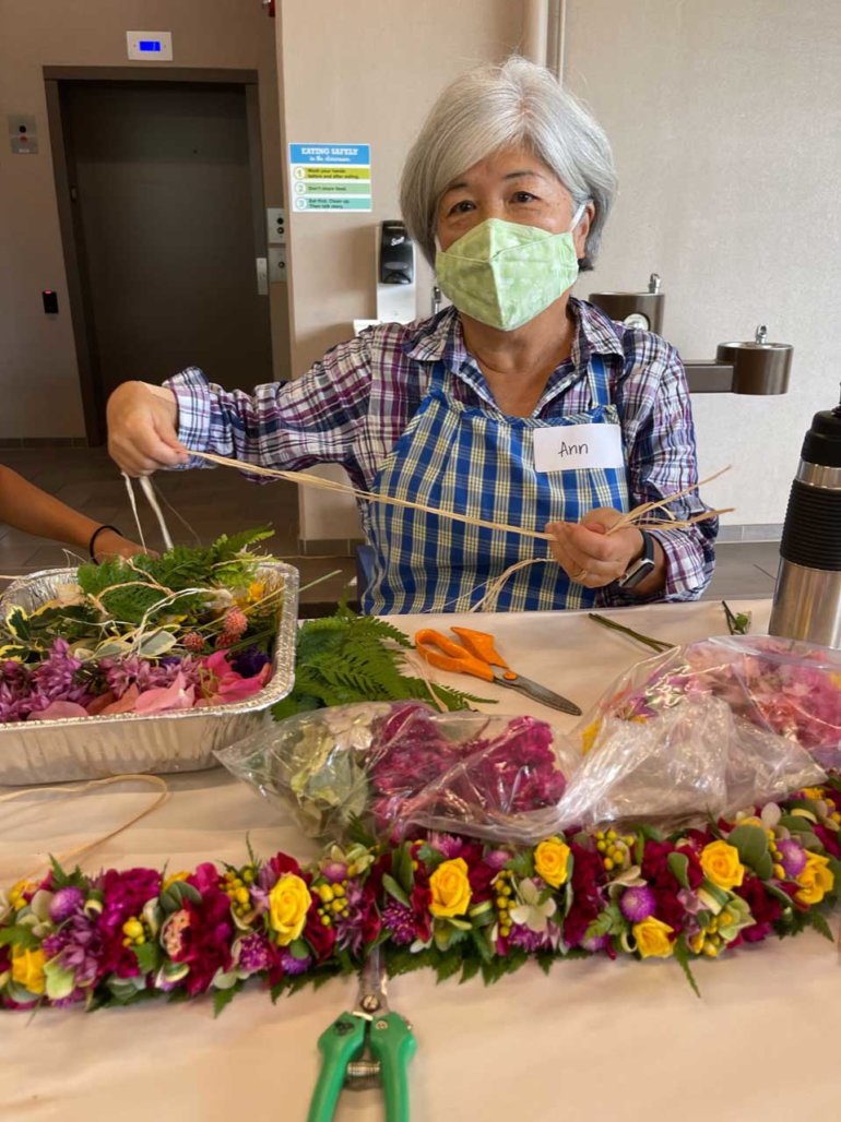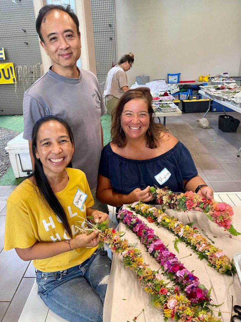 The next day, I received a beautiful letter from someone whose family was suffering the loss of a beloved member. With her permission, I wanted to share what she wrote: “You said in an earlier email that making lei is about love, and the workshop so deeply embodied that feeling. I left feeling so much joy and love – love for you all for providing the space, guidance and experience. And also for the care that went into preparing all of the flowers and greens and gathering such wonderful teachers. Being there felt like being home. The three hours flew by and reminded me of how focusing on something and bringing that feeling of love and care to the flowers is a way of tending to our hearts and spirits, too. Thank you so much, I was transformed by my time there.”