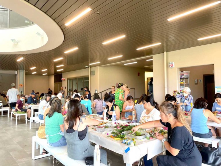 This past October, participants gathered in the Kosasa Community Oculus for this year’s first Punahou Carnival Haku Lei Booth workshop. The workshops are a unique opportunity to work with master lei makers. A myriad of plant and flower varieties were gathered and donated, rounded out by purchased flowers. Our fabulous team of student chairs prepped materials and greeted all those participating.