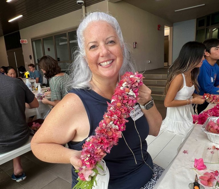 I attended my first Punahou lei workshop 13 years ago and quickly realized that lei is far more than something to wear in celebration. Lei making is in the care of gathering materials and the heart that is poured into and through it; it is the sharing of a part of oneself and gifting that love to another. I am honored to join my fellow chairs, Cathee, Jen, Joachim and Maile, to share that with our Punahou community.