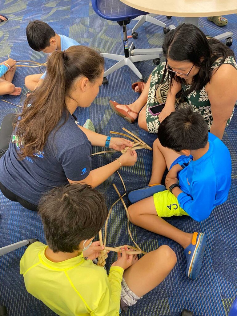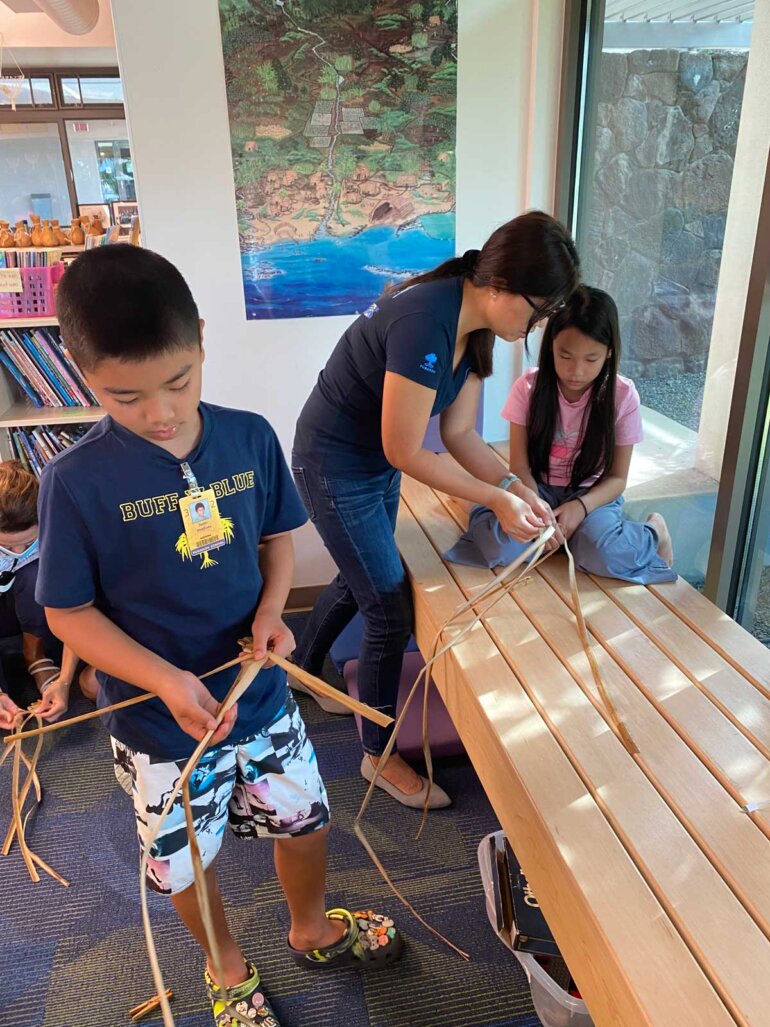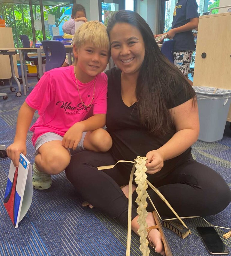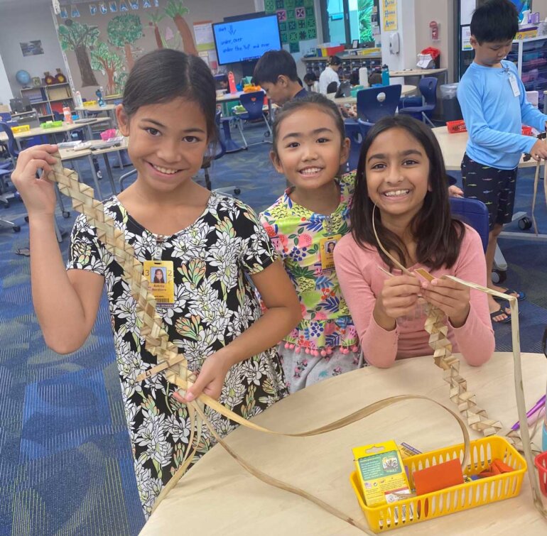 One of the wonderful, beloved traditions of the third grade lū‘au is the opportunity for teachers, parents and students to come together as one ‘ohana to prepare for the event. For weeks, parents have been taking time to join the third grade kumu in working with their classes as they get ready. From husking coconuts, weaving plates and making lei po‘o lauhala, all the way to learning the techniques to prepare delicious traditional lū‘au food, there are numerous ways for families to share the experience with their children. In fact, it is so much more than a volunteer opportunity.