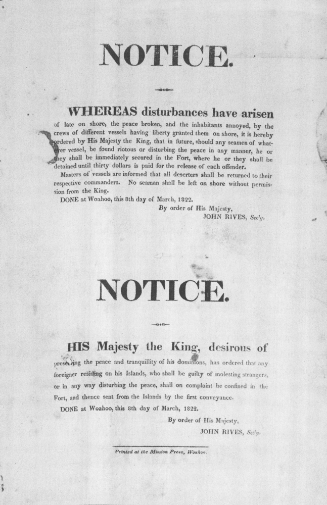 - On March 8, 1822, the government printed its first notices against disturbing the peace. Criers were also dispatched to spread the news in the traditional manner. Levi Chamberlain, business agent for the Mission, noted that “for two or three nights past a crier has been sent out to proclaim in the ears of the people an edict from the Chiefs – … That the people are not to play at ulumaita, pahee, puhenehene, cards, &etc. but turn to the palapala.”1