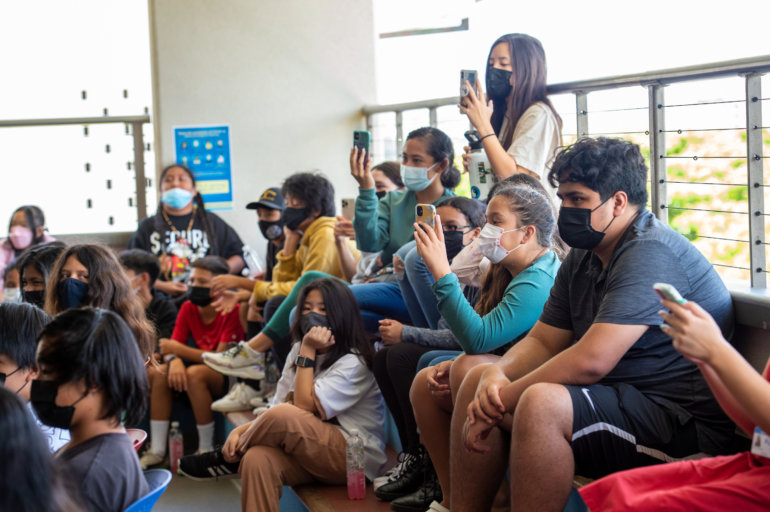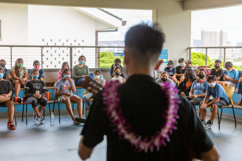 The visits were part of an ukulele and creative writing course in the Clarence T. C. Ching PUEO Program. The course was piloted this summer in cooperation with the Fender Play Foundation, a nonprofit dedicated to increasing access to music education. Punahou Trustee Mark Fukunaga ’74 also visited the classes to experience firsthand what students were learning.