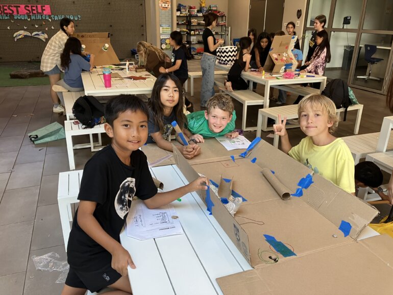 At the peak of school-year excitement, with the end of Punahou Carnival and the approach of Spring break, third, fourth and fifth graders embarked on a journey of entrepreneurship, crafting and post-carnival creativity. The Case Accelerator for Student Entrepreneurship (CASE), directed by Yolanda Lau, worked in tandem with Academy students and Punahou’s After-School Care (ASC) program put on a hands-on experience for younger students. Together, they hosted a three-day innovation sprint in the Kosasa Community’s Inspiration Cafe benefiting the School’s annual food drive.