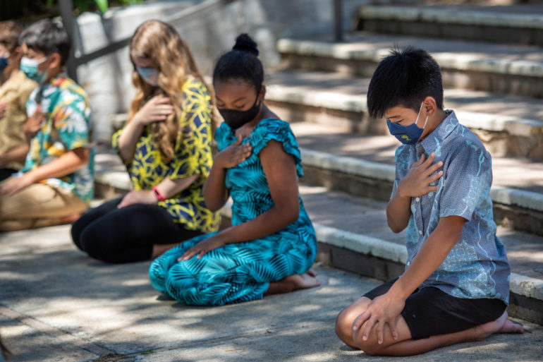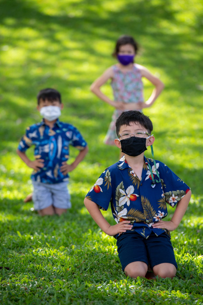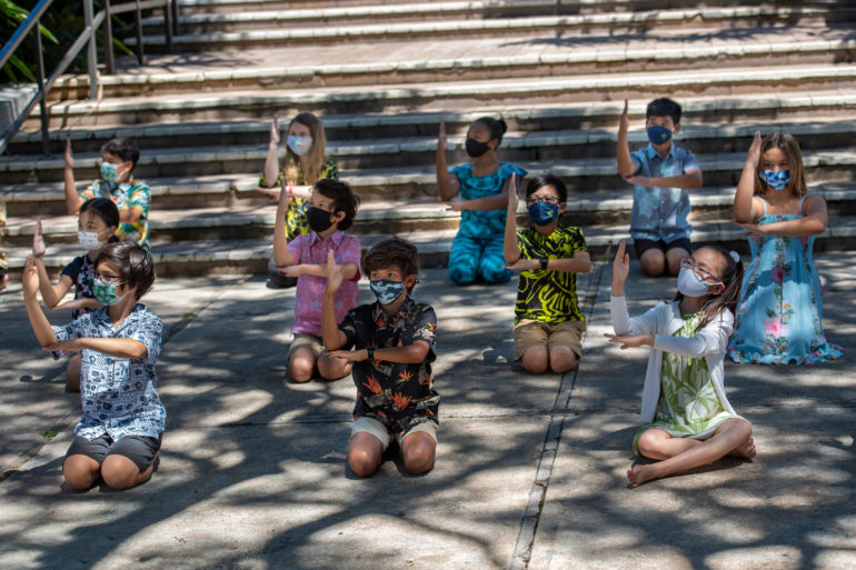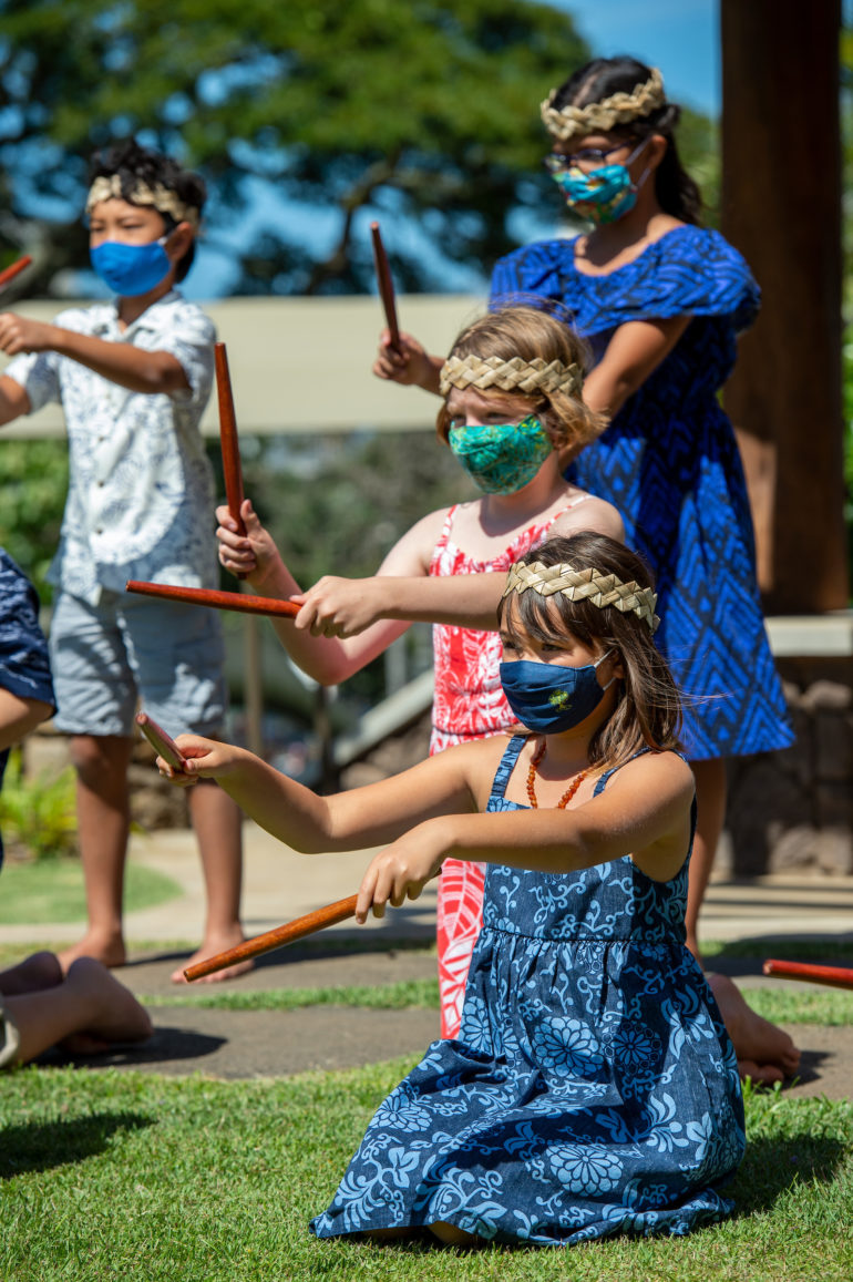 The elaborate video production was a huge logistical undertaking, coordinated by a team of kumu who taught students the various mele and dances, then arranged for each cohort to be videotaped at locations around campus. Punahou’s video production team shot and edited the footage, virtually bringing children at different grade levels together. At-home learners were included by submitting their own footage.