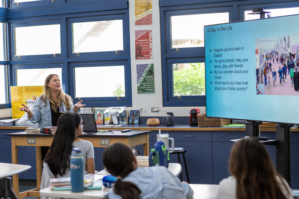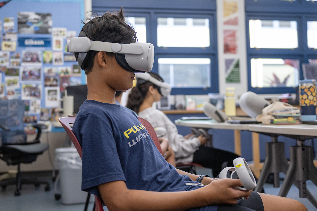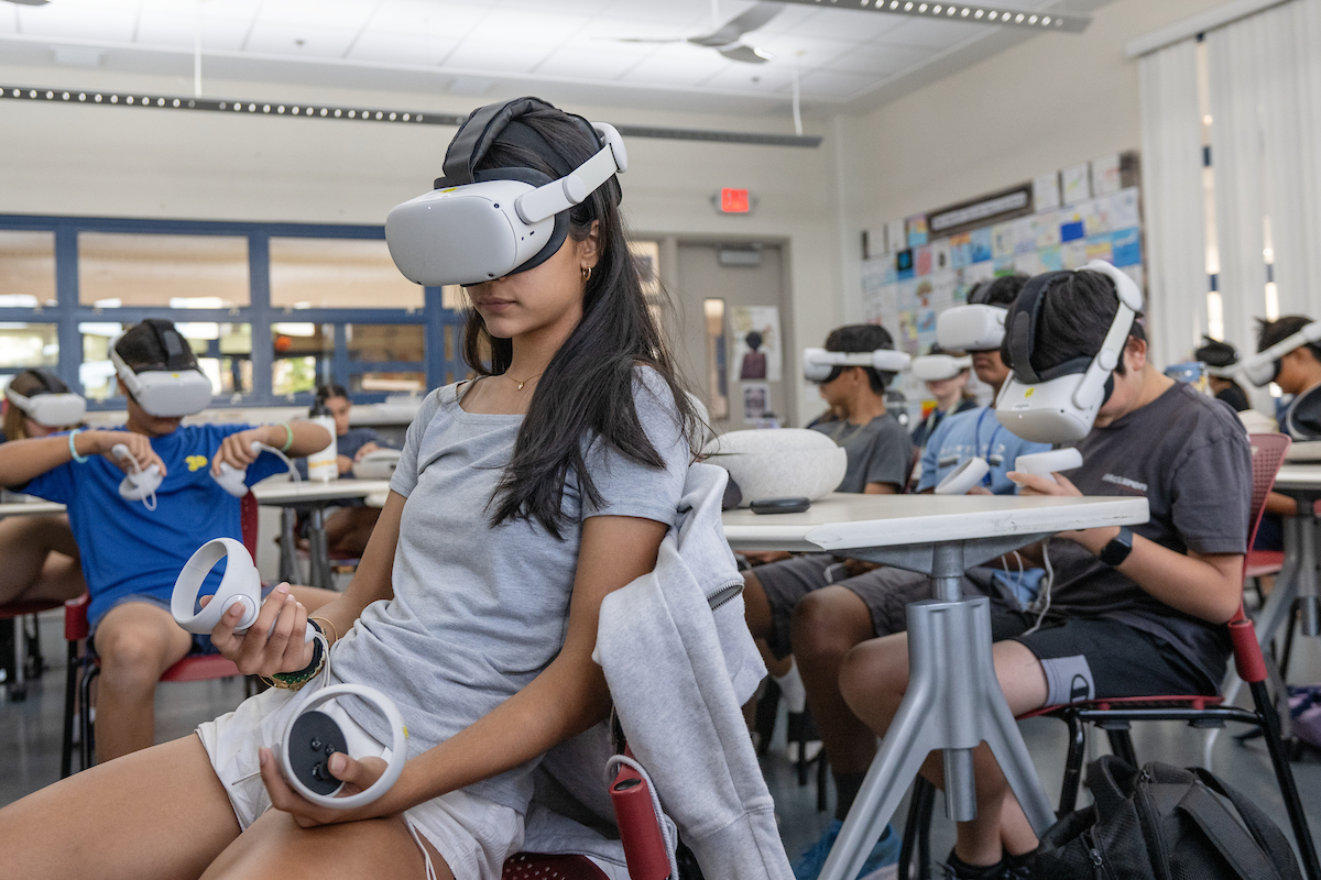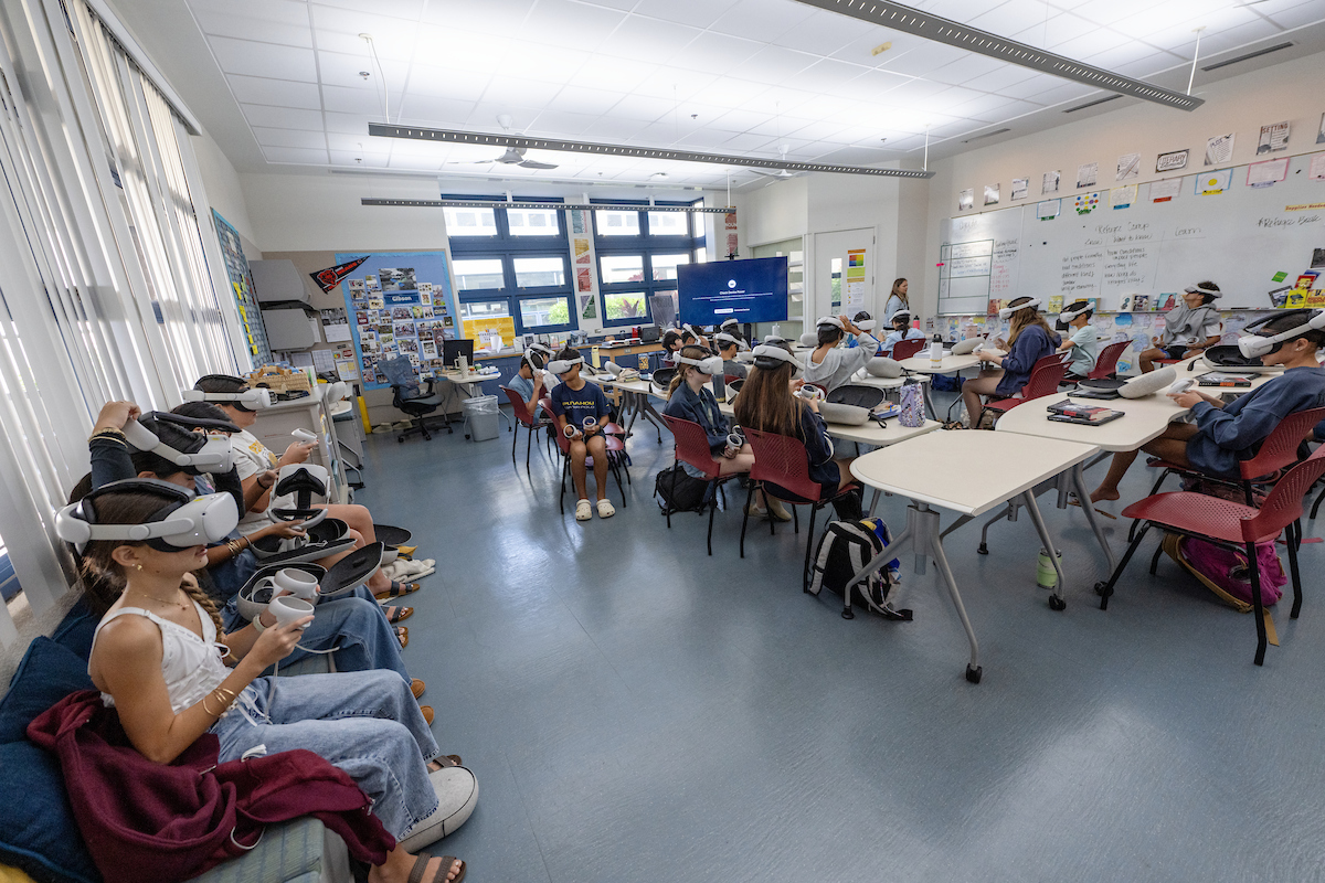 Literature came to life for seventh grade English students as they used Oculus VR headsets to explore a Syrian refugee camp while reading “Refugee” by Alan Gratz. The novel highlights the struggles and resilience of three young refugees from different time periods – Nazi Germany, 1990s Cuba, and modern-day Syria.