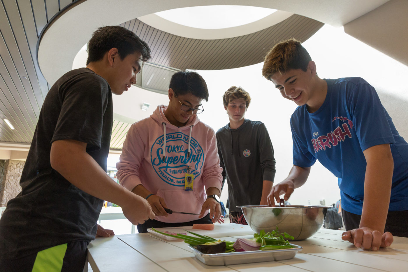 Chef Mark Noguchi ’93, Punahou’s K – 12 food curriculum specialist, walked the freshman through a recipe for ceviche, a seafood dish made by curing fresh fish in lemon and lime juice. While Noguchi demonstrated, biology teacher Kyle Fujimoto ’05 explained how citric acid changes proteins, “cooking” the fish without heat.