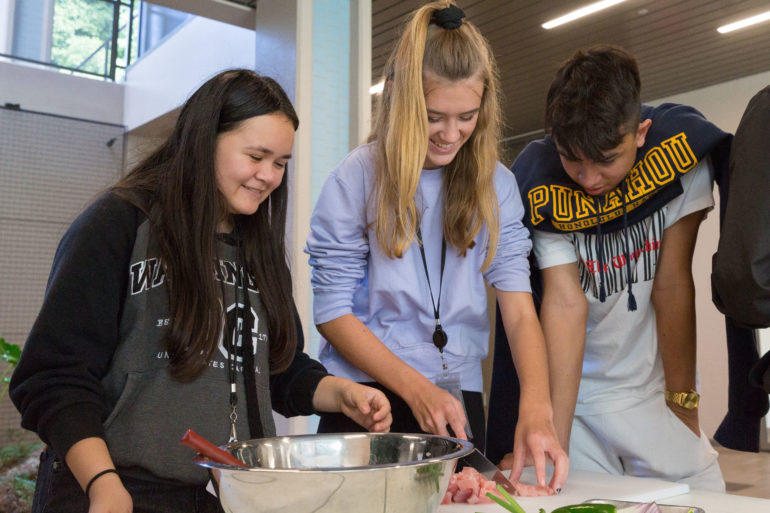 The new teaching kitchen in the Sidney and Minnie Kosasa Community for Grades 2 – 5 recently was put to use by some of its first chefs-in-the-making. Academy biology students gathered in the new facility situated within the K – 8 Junior School Learning Commons to learn about proteins.
