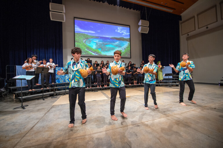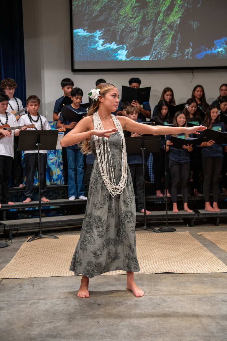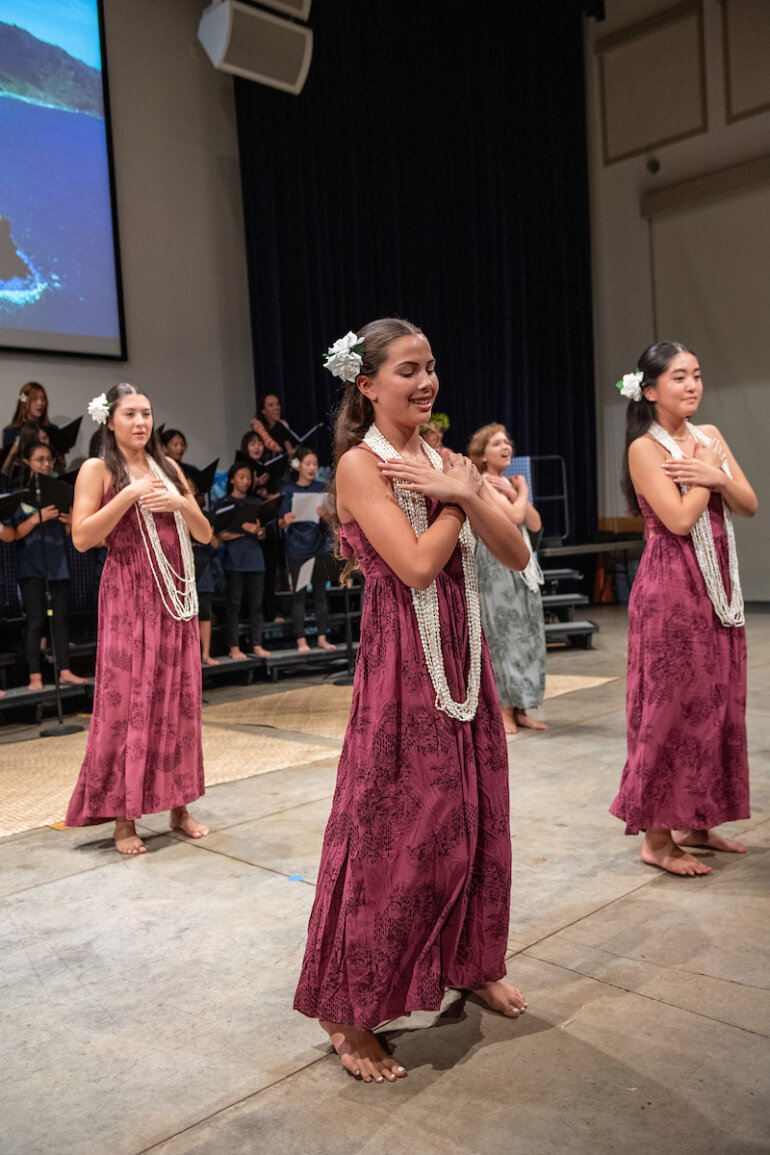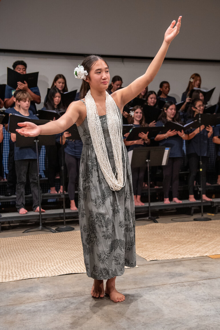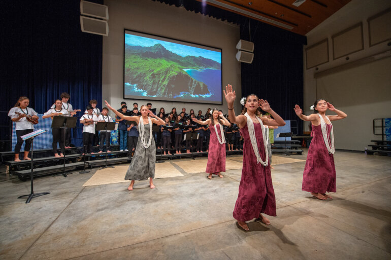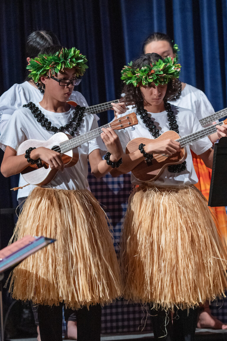 The eighth grade Hawaiian music class, developed two years ago by Junior School music faculty member Lauren Chang ’01 Williams, teaches students not just music theory and Hawaiian music but also essential performance skills. Throughout the course, students learned to interpret and sing sheet music, dance hula and play the ʻukulele. The class has enabled many students, who previously did not see themselves as musicians or performers, to confidently present an entire Hōʻike, or concert.
