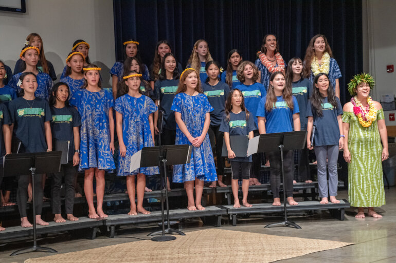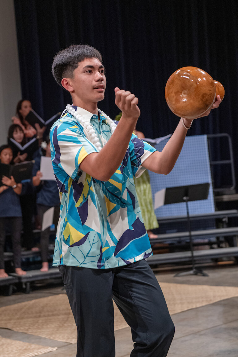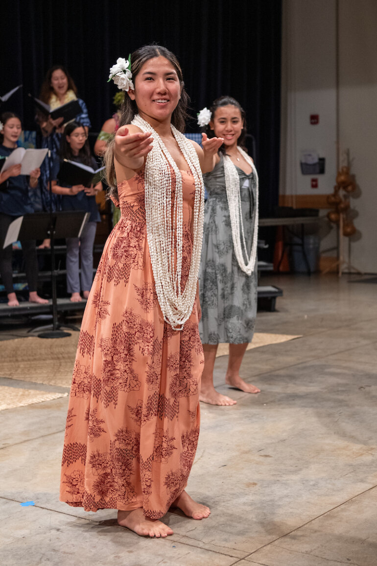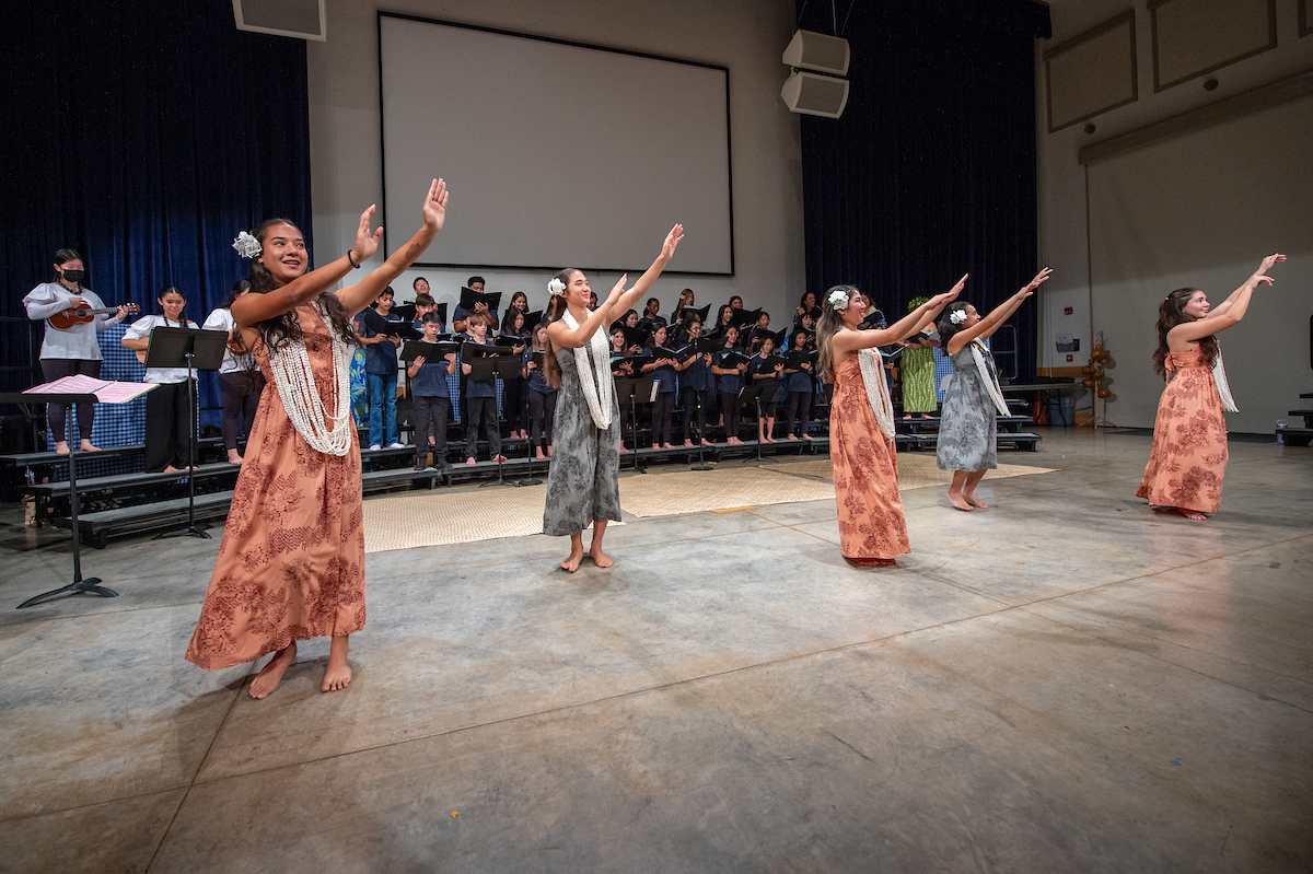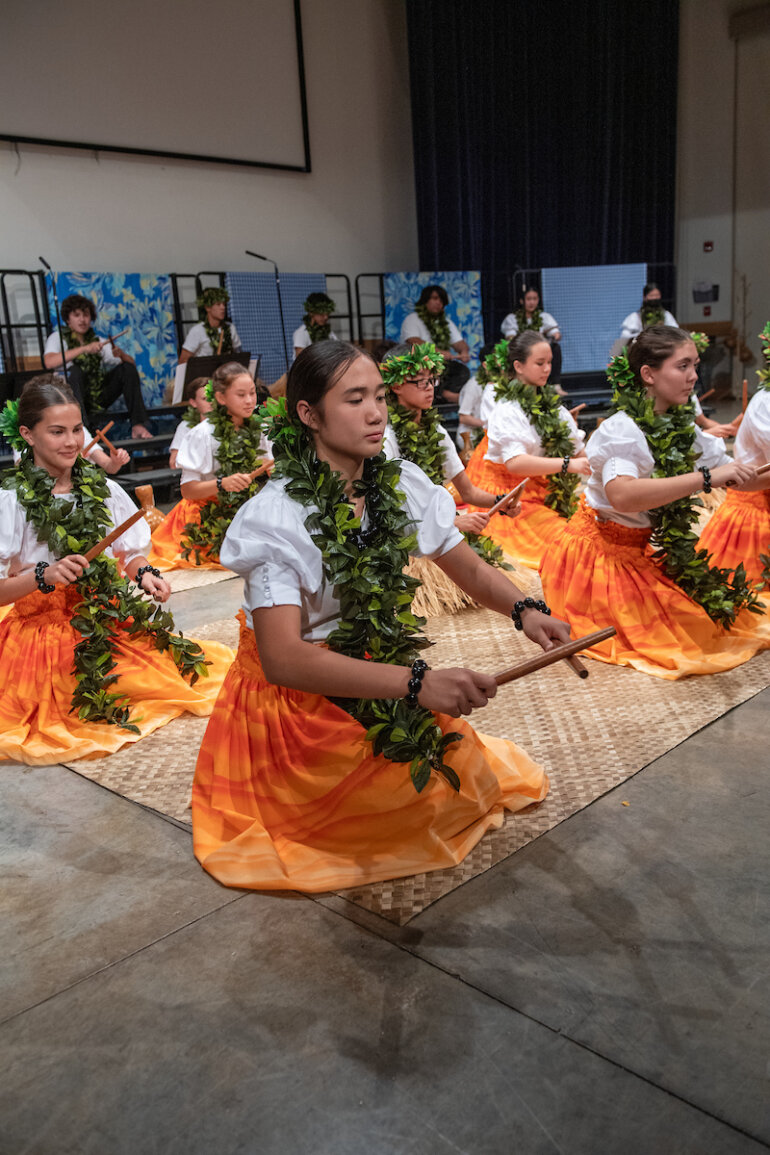 The eighth grade Hawaiian music class, developed two years ago by Junior School music faculty member Lauren Chang ’01 Williams, teaches students not just music theory and Hawaiian music but also essential performance skills. Throughout the course, students learned to interpret and sing sheet music, dance hula and play the ʻukulele. The class has enabled many students, who previously did not see themselves as musicians or performers, to confidently present an entire Hōʻike, or concert.