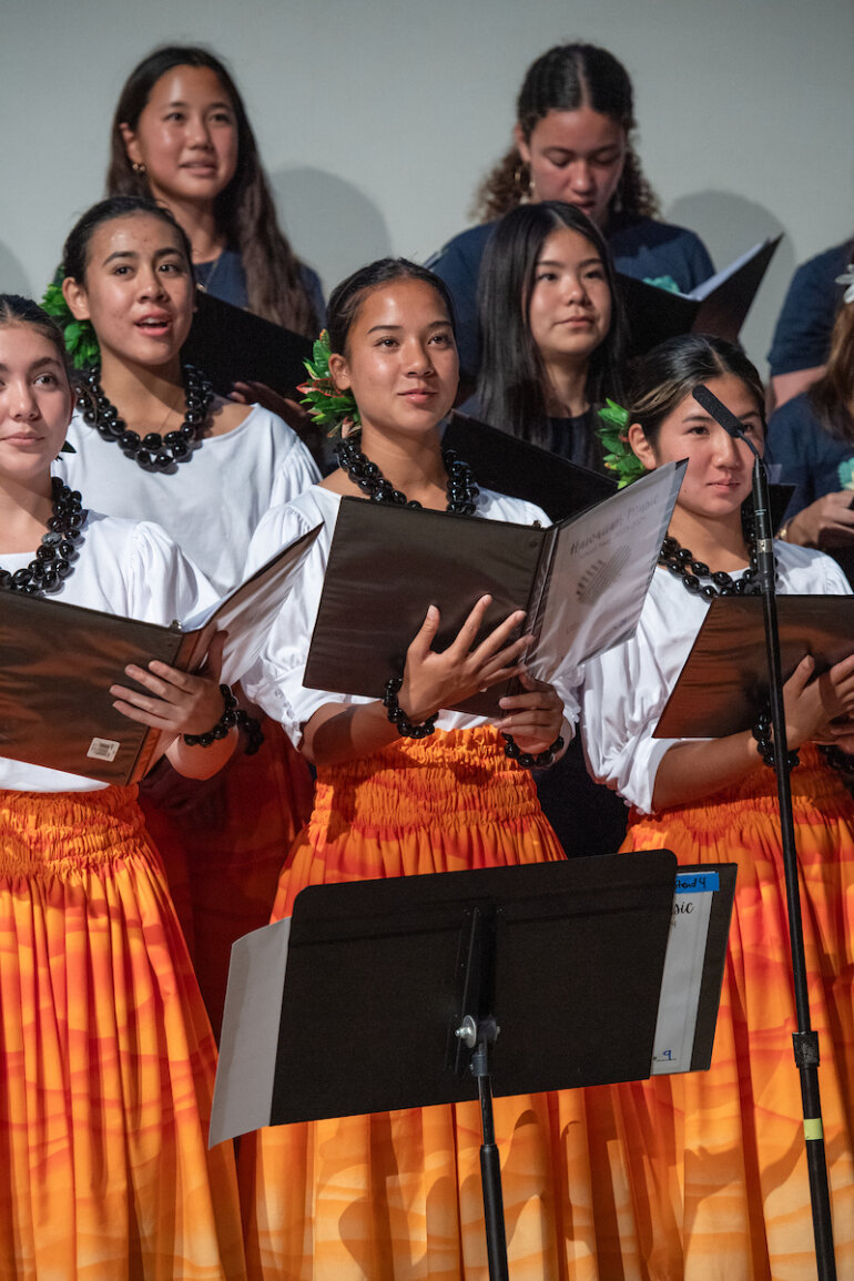 The concert focused on the legacy of Mary Kawena Pukui, a wonderful coincidence given that the Academy Learning Commons was named in her honor ahead of the event. Through studying Pukui’s life, mele and the ʻŌlelo Noʻeau she collected, the students gained a deeper understanding of Hawaiian culture. Her work provides vital guidance, or ʻike kūpuna, grounded in Hawaiian heritage.